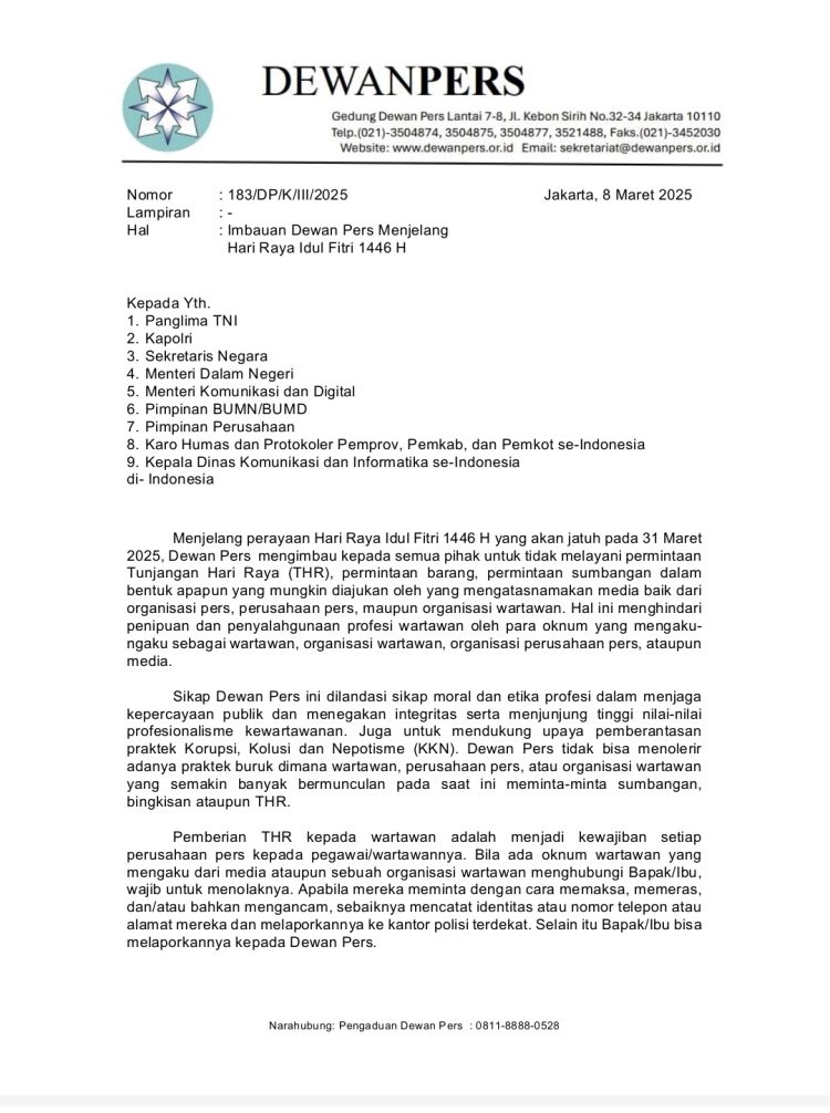 Menjelang Hari Raya Idul Fitri 1446 H, Dewan Pers kembali menegaskan komitmennya dalam menjaga independensi dan profesionalisme pers dengan melarang segala bentuk permintaan THR oleh wartawan di luar ketentuan perusahaan media. Dewan Pers juga mengingatkan masyarakat untuk waspada terhadap oknum yang mengatasnamakan wartawan dalam melakukan praktik pemerasan.