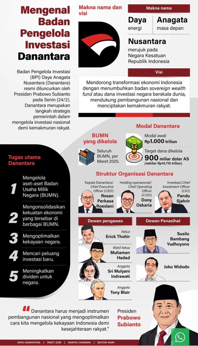Badan Pengelola Investasi (BPI) Daya Anagata Nusantara (Danantara) resmi diluncurkan oleh Presiden Prabowo Subianto pada Senin (24/2). Danantara merupakan langkah strategis pemerintah dalam mengelola investasi nasional demi kemakmuran rakyat.