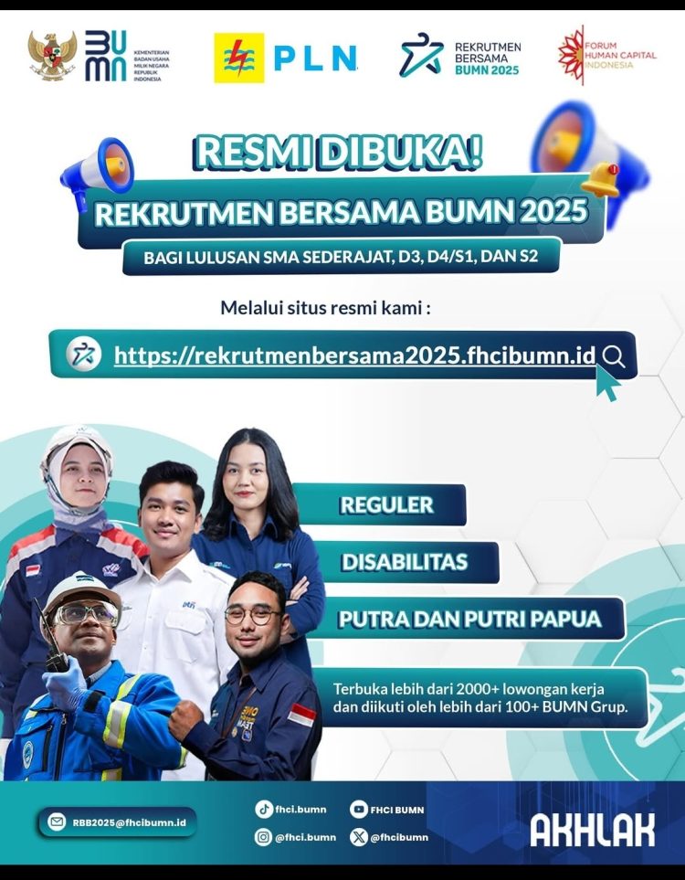 “Informasi resmi RBB 2025 hanya dibagikan melalui Instagram Kementerian BUMN dan @fhci.bumn,” tukasnya juga melalui situs resmi http://rekrutmen bersama2025.fhcibumn.id.(alhafiz-editor01)