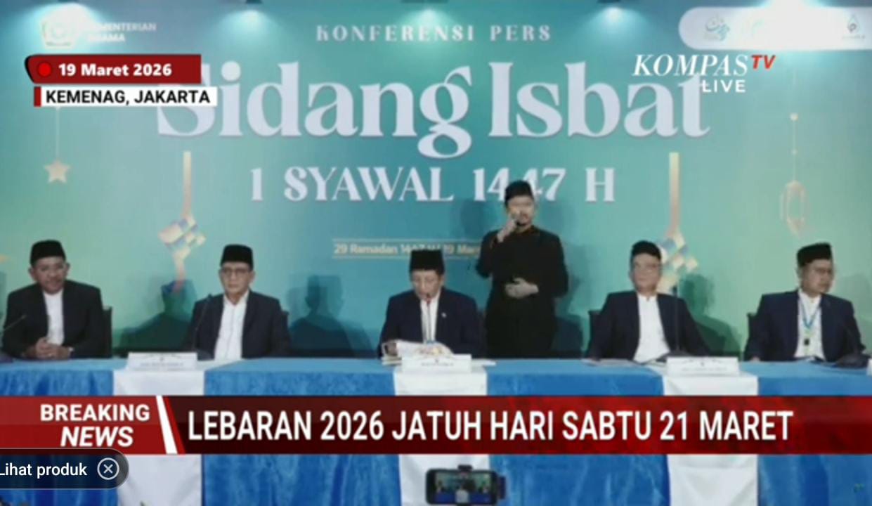 “Berdasarkan hisab dan tidak adanya hilal terlihat, disepakati bahwa 1 Syawal 1447 Hijriah jatuh pada Sabtu 21 Maret 2026,” kata Menteri Agama (Menag) RI Nasaruddin Umar dalam Konferensi Pers Sidang Isbat 1 Syawal 1447 Hijriah di Kantor Kemenag, Jakarta, Kamis 19 Maret 2026.