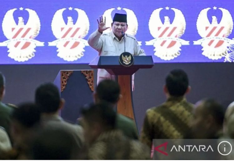 metrodeli/istimewa ARAHAN: Presiden Prabowo Subianto memberikan arahan saat menghadiri acara Halalbihalal Persatuan Purnawirawan TNI Angkatan Darat (PPAD) di Jakarta, Selasa 6 Mei 2025. ANTARA FOTO/Hafidz Mubarak A/Spt/aa.