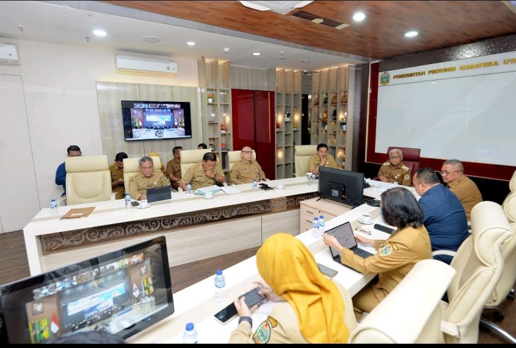 Wakil Gubernur (Wagub) Sumut Surya bersama Sekdaprov Sumut Togap Simangunsong mengikuti rapat koordinasi (Rakor) penanganan inflasi, kemiskinan, dan menyikapi situasi terkini pascademo, yang dipimpin  Menteri Dalam Negeri (Mendagri) Muhammad Tito Karnavian. Rakor diselenggarakan secara zoom dan offline, di lantai 6, ruangan Sumut Smart Province, Senin 8 September 2025.