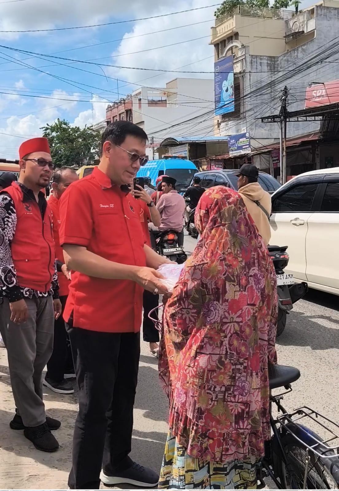 Di tengah lalu lintas padat di Jalan Platina Raya, Ketua DPC PDI Perjuangan Kota Medan Hasyim, SE tampak berdiri menyapa para pengemudi satu per satu sambil menyerahkan nasi kotak untuk makan siang.