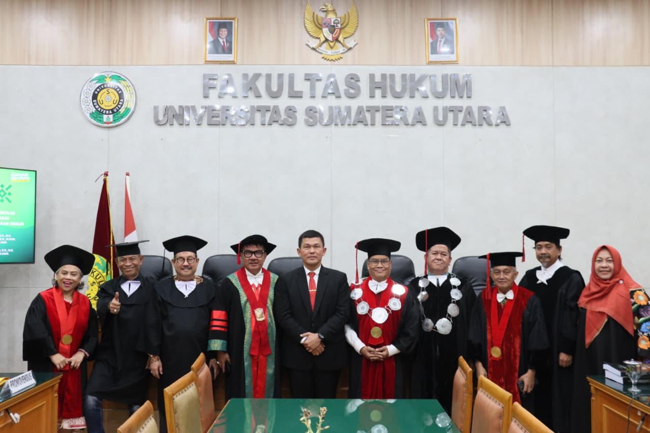 “Saya sangat bangga, FH-USU mempunyai lulusan doktor seperti Dr Ronald Fredy Christian Sipayung, SIK, MH. Jangan hanya berhenti di sini gelar doktor pintu untuk berkiprah di dunia hukum, apalagi Doktor Ronald merupakan seorang Kapolres saat ini menjabat sebagai Kapolresta Bandara Soekarno-Hatta,” paparnya.