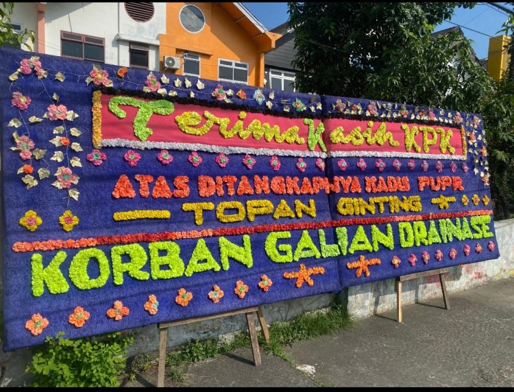 Karangan bunga tersebut berisi ucapan terima kasih kepada KPK atas penangkapan Topan Ginting yang kini telah ditetapkan sebagai tersangka kasus dugaan suap proyek jalan di Sumatera Utara. Di antaranya bertuliskan: “Terima kasih KPK atas ditangkapnya Kadis PUPR Topan Ginting”, dengan berbagai pengirim mulai dari “Stadion Teladan dan Lapangan Merdeka”, “Korban Galian Drainase”, hingga “Warga yang Terzalimi”.