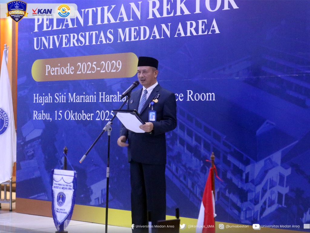 Universitas Medan Area (UMA) menggelar acara Pelantikan Rektor Periode 2025–2029 yang berlangsung dengan khidmat di Convention Hall Hj. Siti Mariani Harahap, Lantai 3 Gedung Perpustakaan UMA, Rabu 15 Oktober 2025.