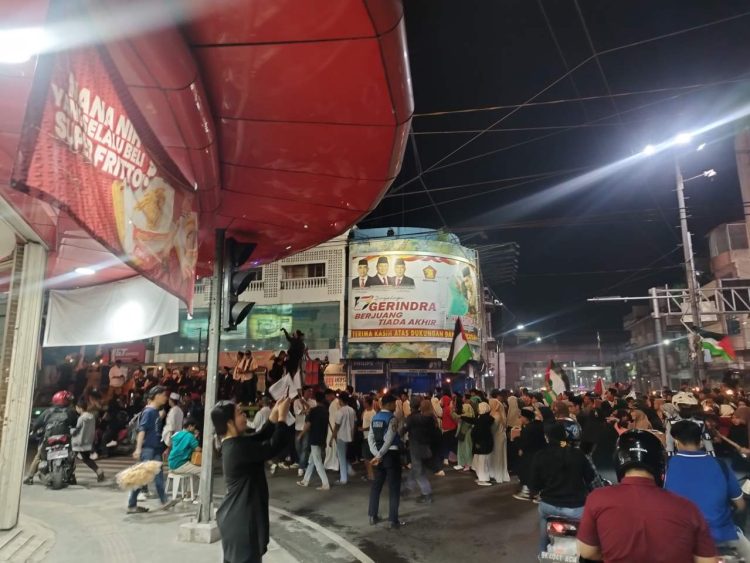 Berdasarkan pantauan metrodeli, Rabu 26 Februari 2025, seribuan peserta tampak serentak memegang obor dan beberapa membawa bendera Palestina.