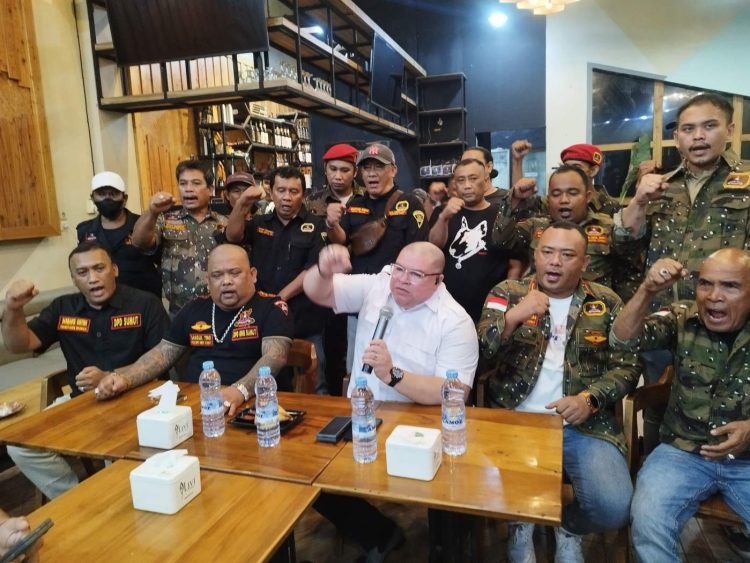 metrodeli/alhafiz wr lubis TEMUPERS : Ketua Umum GRIB Jaya H. Hercules Rizario Marshal yang diwakilkan Kabid Komunikasi Publik/Humas DPP GRIB JAYA, Dr Razman Arif Nasution bersama Ketua GRIB Sumut Syamsul Tarigan serta seluruh GRIB Sumut dan Medan saat menggelar temu pers di Cafe Roaster di Kompleks J City, Medan, kemarin.