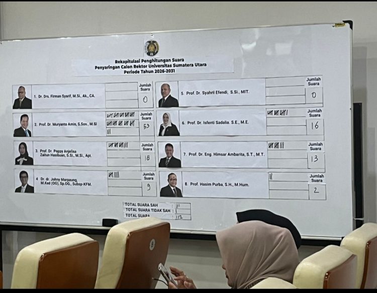 Senat Akademik (SA) Universitas Sumatera Utara (USU) baru saja melakukan pemilihan calon rektor di Ruang Senat Akademik, Biro Rektor USU, Kamis 25 September 2025 untuk menentukan tiga besar Calon Rektor USU dari delapan calon yang lolos penjaringan untuk audisi. Setelah melakukan voting (one man one vote), sebanyak 112 anggota senat melaksanakan pemilihan yang demokratis, jujur dan adil.
