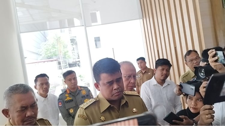 metrodeli/istimewa DOORSTOP: Gubsu M Bobby Afif Nasution didampingi Inspektorat Daerah Sumut Sulaiman Harahap, Plh Sekda Arman Effendy Pohan, Plt Kadis Kominfo Sumut Porman Mahulae menjelaskan saat doorstop di lobby kantor Gubsu, Senin 30 Juni 2025.