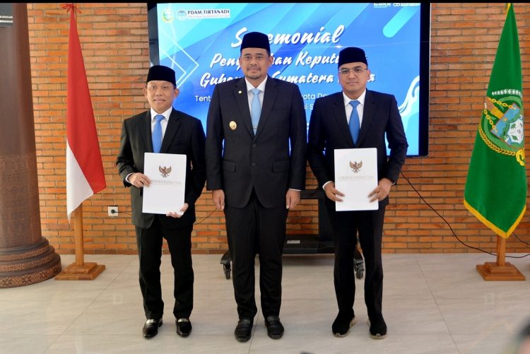 Gubernur Sumatera Utara (Sumut) Muhammad Bobby Afif Nasution menyerahkan Surat Keputusan (SK) Gubernur Sumut tentang pengangkatan dua anggota Dewan Pengawas Perusahaan Umum Daerah (Perumda) Tirtanadi. Kedua dewan pengawas tersebut yakni Yudha Johansyah, dan Andi Atmoko Panggabean.