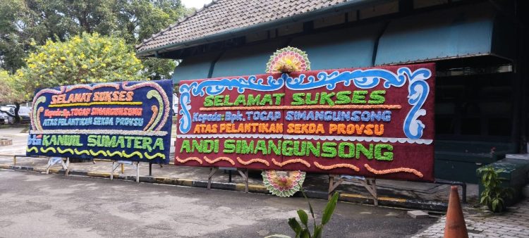 Sejumlah karangan bunga ucapan selamat atas dilantiknya Togap Simangunsong sebagai Sekdaprovsu terpampang di Kantor Gubsu, Rabu, 9 Juli 2025.