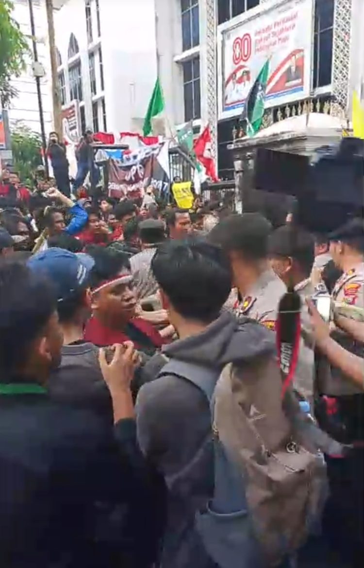 Bentrokan terjadi setelah massa mahasiswa melempari aparat kepolisian dengan tomat busuk sebagai simbol protes terhadap kinerja wakil rakyat.